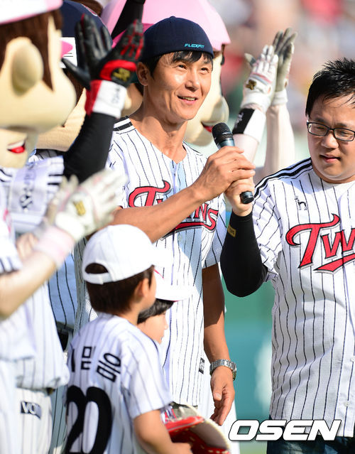 15일 오후 서울 잠실야구장에서 열린 '2013 한국야쿠르트 세븐 프로야구' LG 트윈스와 넥센 히어로즈의 경기, 경기에 앞서 배우 이정용이 시구 시타자로 나선 아들 이믿음, 이마음 군과 마운드에 올라 팬들에게 인사를 하고 있다.