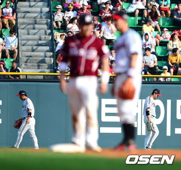 15일 오후 서울 잠실야구장에서 열린 '2013 한국야쿠르트 세븐 프로야구' LG 트윈스와 넥센 히어로즈의 경기, 3회초 1사 2루에서 좌익수 LG 이병규(7)가 넥센 서건창의 타구를 잡고 수비 위치로 향하고 있다. 중견수로는 이병규(9)가 출전했다.