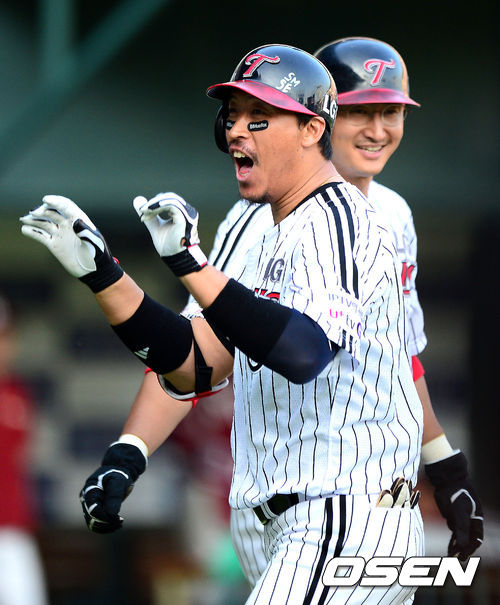 15일 오후 서울 잠실야구장에서 열린 '2013 한국야쿠르트 세븐 프로야구' LG 트윈스와 넥센 히어로즈의 경기, 5회말 2사 만루에서 LG 이병규가 만루홈런을 날리고 홈을 밟으며 기뻐하고 있다.