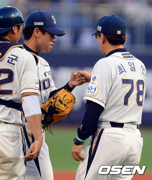 15일 오후 경남 창원시 마산구장에서 열린 2013 한국야쿠르트 세븐프로야구 NC 다이노스와 삼성 라이온즈의 경기, 6회초 1사 1루 NC 이상민이 마운드에 올라 삼성 채태인을 삼진으로 잡아낸 뒤 최일언 코치에게 축하를 받고 마운드에서 내려가고 있다.