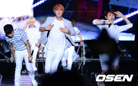 15일 오후 서울 일원동 마루공원에서 열린 그룹 비스트의 '뷰티파티' 게릴라 콘서트에서 그룹 비스트가 화려한 공연을 펼치고 있다.