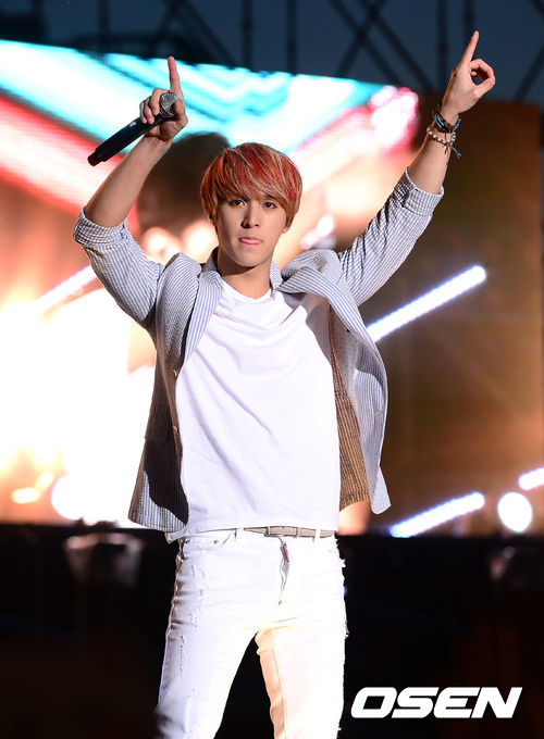 15일 오후 서울 일원동 마루공원에서 열린 그룹 비스트의 '뷰티파티' 게릴라 콘서트에서 그룹 비스트 손동운이 화려한 공연을 펼치고 있다.