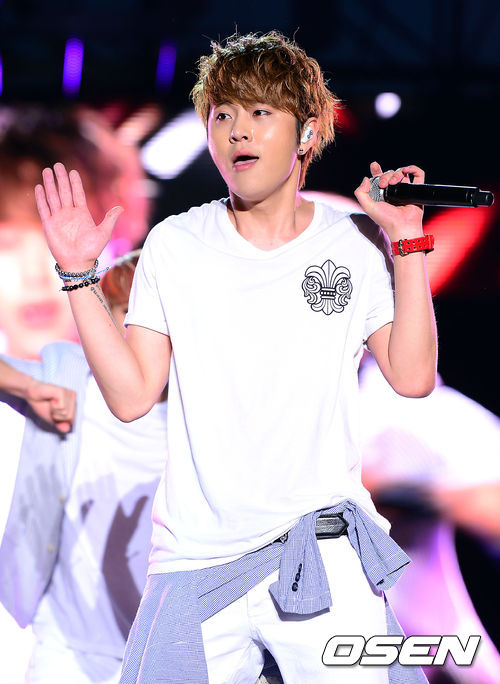 15일 오후 서울 일원동 마루공원에서 열린 그룹 비스트의 '뷰티파티' 게릴라 콘서트에서 그룹 비스트 용준형이 화려한 공연을 펼치고 있다.
