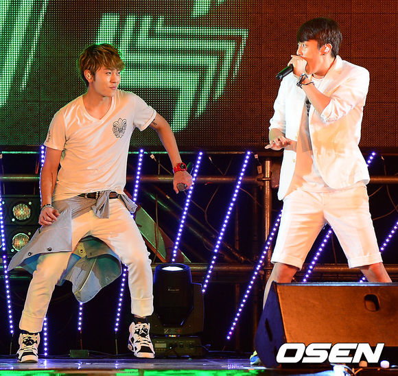 15일 오후 서울 일원동 마루공원에서 열린 그룹 비스트의 '뷰티파티' 게릴라 콘서트에서 그룹 비스트 용준형과 윤두준이 화려한 공연을 펼치고 있다.