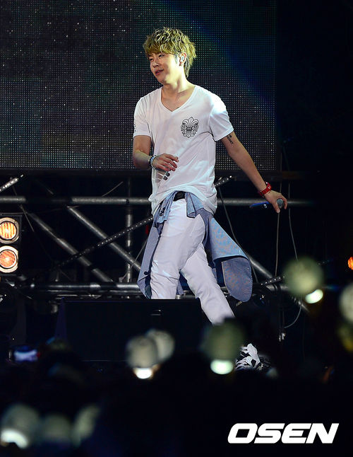 15일 오후 서울 일원동 마루공원에서 열린 그룹 비스트의 '뷰티파티' 게릴라 콘서트에서 그룹 비스트 용준형이 화려한 공연을 펼치고 있다.