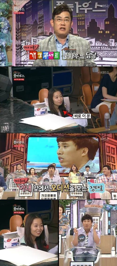 정태호 아내 공개를 감행한 프로는 14일 오후 8시 50분 전파를 탄 KBS 2TV '가족의 품격 풀하우스'다. 바로 개그맨 정태호의 아내가 방송 작가로 활약중인 프로다. 정태호는 아내를 응원하기 위해 '가족의 품격'에 출연했고, 방송중 해당 프로그램의 방송 작가로 있는 아내를 시청자들에게 자랑한 것.