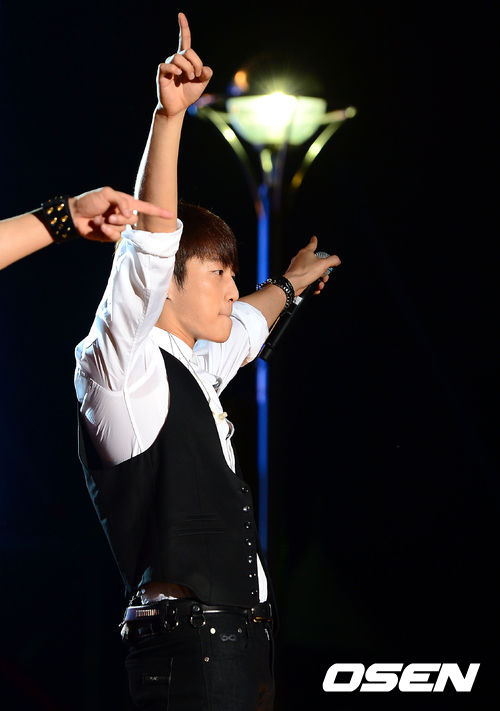 15일 오후 서울 일원동 마루공원에서 열린 그룹 비스트의 '뷰티파티' 게릴라 콘서트에서 그룹 비스트 윤두준이 화려한 공연을 펼치고 있다.