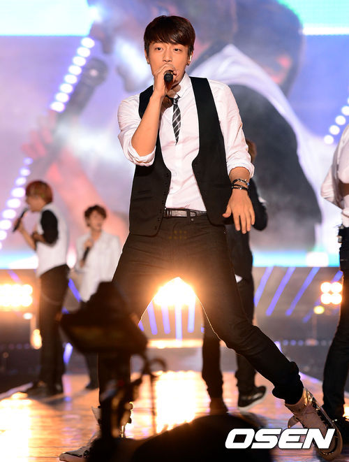 15일 오후 서울 일원동 마루공원에서 열린 그룹 비스트의 '뷰티파티' 게릴라 콘서트에서 그룹 비스트 윤두준이 화려한 공연을 펼치고 있다.