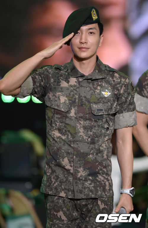 15일 오후 대구 코오롱야외음악당에서 열린 제7회 대구국제뮤지컬페스티벌(DIMF, 이하 딤프) 전야제 'K-뮤지컬 콘서트'에서 슈퍼주니어 이특(본명 박정수)이 거수경례를 하고 있다