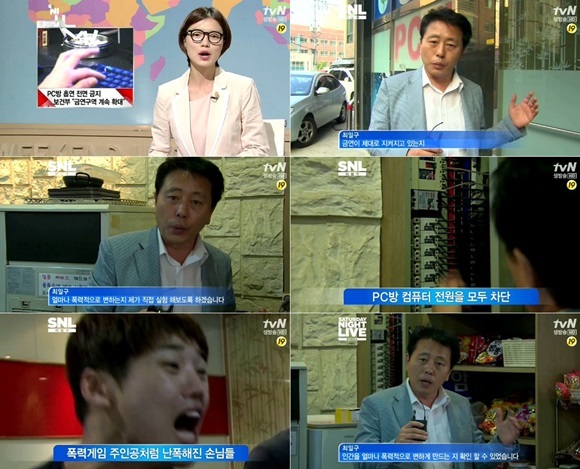15일 오후 방송된 tvN 'SNL코리아'의 코너 '위켄드 업데이트'에서 최일구는 '현장출동'이라는 코너 속 코너로 야외 VCR 촬영에 나섰다. 그는 피시방 전원을 내린 후 게임의 폭력성을 진단하는 실험으로 비난여론을 맞았던 MBC 뉴스 내용을 그대로 패러디해 금연 구역으로 설정된 피시방 전원을 내려 손님들의 폭력성을 진단(?)했다.