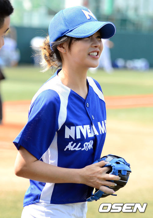 16일 오전 서울 광진구 구의구장에서 진행된 ‘제 4회 니베아 맨 컵 전국생활체육 야구대회 개막식'에서 이영아가 그라운드로 들어서고 있다.
