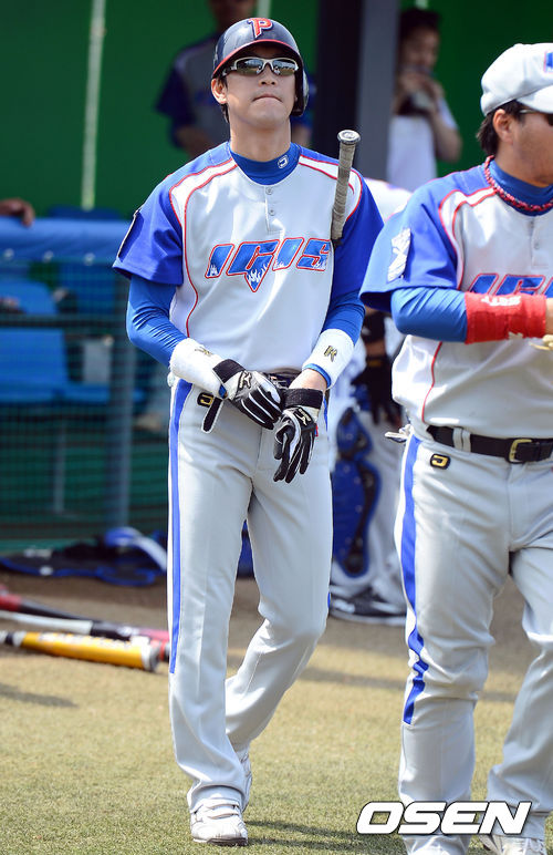 16일 오전 서울 광진구 구의구장에서 진행된 ‘제 4회 니베아 맨 컵 전국생활체육 야구대회'에서 연예인야구단 이기스 오만석이 그라운드로 들어서고 있다.