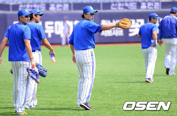 16일 오후 경남 창원시 마산구장에서 열린 2013 한국야쿠르트 세븐프로야구 NC 다이노스와 삼성 라이온즈의 경기, 경기에 앞서 삼성 이승엽이 스트레칭을 위해 외야로 이동하하고 있다.