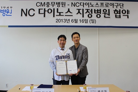 NC 다이노스(대표이사 이태일)과 CM충무병원(병원장 이상훈)이 16일 오전 마산야구장에서 배석현 NC 다이노스 단장, 이상훈 CM충무병원 병원장이 참석한 가운데 지정병원 협약식을 진행했다.
