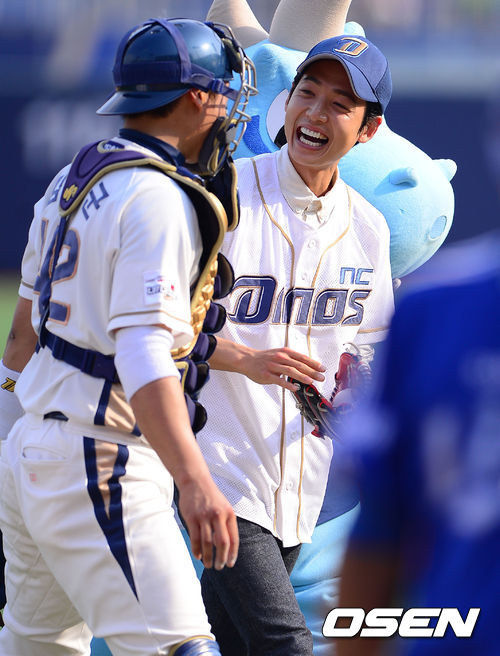 16일 오후 경남 창원시 마산구장에서 열린 2013 한국야쿠르트 세븐프로야구 NC 다이노스와 삼성 라이온즈의 경기, 경기에 앞서 배우 정경호가 시구를 마친후 김태군 포수와 이야기를 나누고 있다.