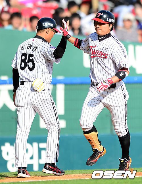 16일 오후 잠실야구장에서 열린 '2013 한국야쿠르트 세븐 프로야구' LG 트윈스와 넥센 히어로즈의 경기, 2회말 1사 3루에서 LG 이진영이 우월 투런 홈런을 치고 최태원 코치와 하이파이브를 하고 있다.
