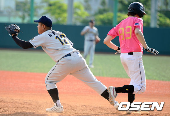 16일 오후 서울 광진구 구의구장에서 진행된 ‘제 4회 니베아 맨 컵 전국생활체육 야구대회' 폴라 베어스와 잘생긴KUBIZ의 경기, 폴라 베어스 송호범이 잘생긴KUBIZ 타자를 1루에서 포스아웃처리 하고 있다.