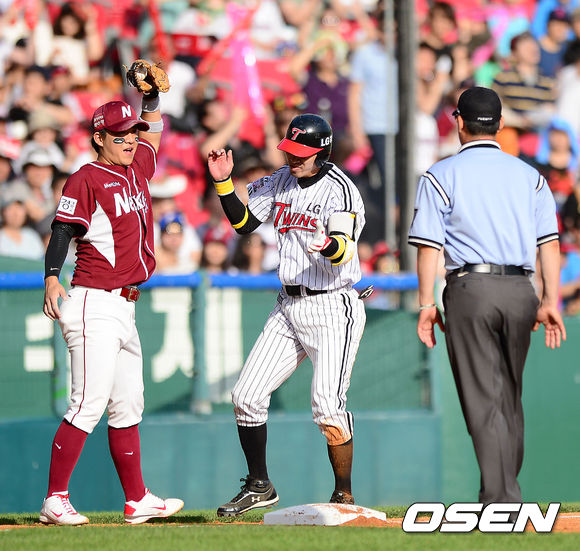 16일 오후 잠실야구장에서 열린 '2013 한국야쿠르트 세븐 프로야구' LG 트윈스와 넥센 히어로즈의 경기, 2회말 1사 1루에서 LG 정성훈이 우전 적시 3루타를 치고 환호하고 있다.