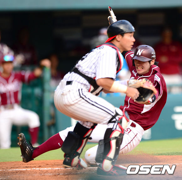 16일 오후 잠실야구장에서 열린 '2013 한국야쿠르트 세븐 프로야구' LG 트윈스와 넥센 히어로즈의 경기, 3회초 1사 3루에서 넥센 이택근의 희생플라이 때 3루주자 장기영이 홈으로 쇄도해 세이프 되고 있다.