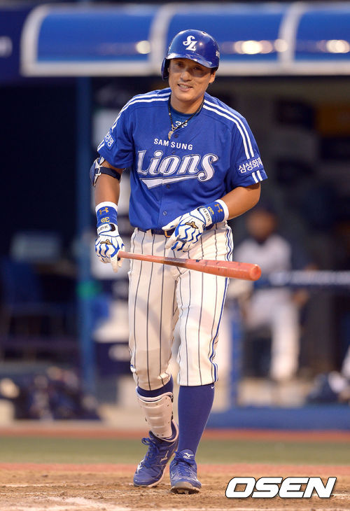 16일 오후 경남 창원시 마산구장에서 열린 2013 한국야쿠르트 세븐프로야구 NC 다이노스와 삼성 라이온즈의 경기,7회초 1사 2루 삼성 이승엽이 삼진아웃 당한 뒤 실소 짓고 있다