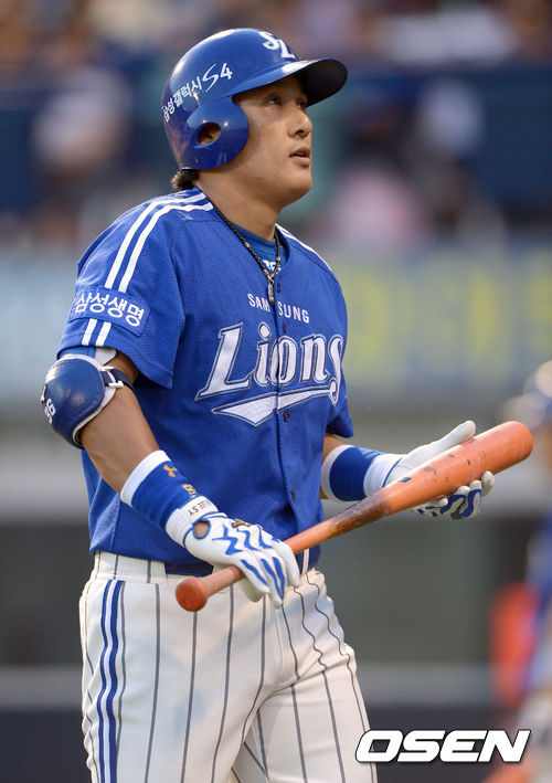 16일 오후 경남 창원시 마산구장에서 열린 2013 한국야쿠르트 세븐프로야구 NC 다이노스와 삼성 라이온즈의 경기,7회초 1사 2루 삼성 이승엽이 삼진아웃 당한 뒤 아쉬워하고 있다