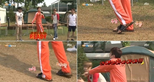 그룹 신화의 에릭이 지압신발을 신은 채 보깅댄스 추기 벌칙을 받았다.