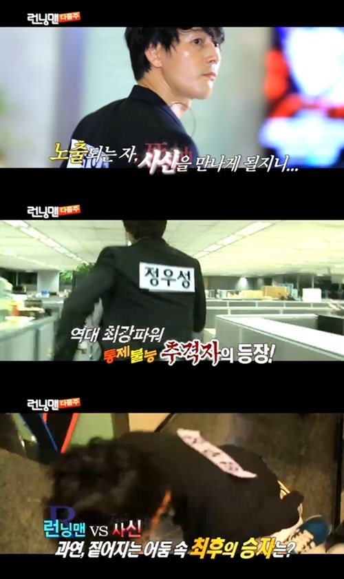 특히 방송 후반부에는 '108개의 눈을 가진 사신'이라는 제목의 '런닝맨' 다음 방송의 예고편이 공개돼 눈길을 끌었다. 이날 '런닝맨'에는 그동안 예능프로그램에 출연하지 않았던 정우성이 게스트로 출연해 기대감을 높였다.