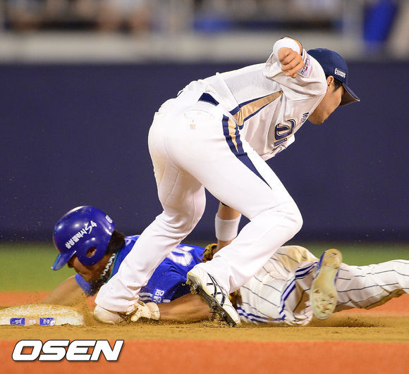 16일 오후 경남 창원시 마산구장에서 열린 2013 한국야쿠르트 세븐프로야구 NC 다이노스와 삼성 라이온즈의 경기,연장 10회초 무사 1루 삼성 정형식의 타석때 도루 시도한 1루 주자 배영섭이 NC 지석훈 2루수에게 태그아웃되고 있다