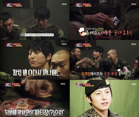 이날 방송에서 지옥의 유격 훈련을 받은 멤버들은 잠시 막사에서 휴식 시간을 가지며 훈련 전 PX에서 미리 사온 간식거리를 펼쳐놓고 담소를 나눴다. 그리고 멤버들이 정신 없이 과자를 먹는 동안 ‘군대 요리 전문가’ 류수영은 새로운 음식이 생각났다며 몇 개 안 되는 재료로 요리를 시작했다.
