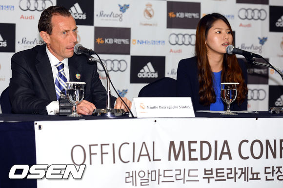 17일 오후 서울 소공동 롯데호텔 그랜드볼룸에서 레알 마드리드 부트라게뇨 단장이 취재진의 질문에 답을 하고 있다.