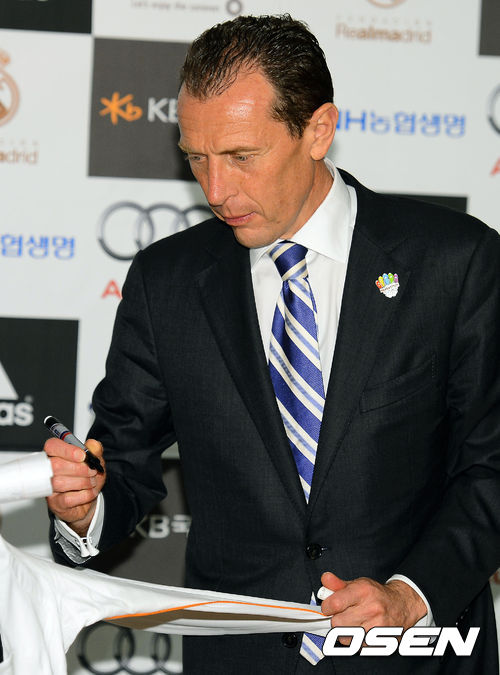 17일 오후 서울 소공동 롯데호텔 그랜드볼룸에서 레알 마드리드 부트라게뇨 단장이 축구 유니폼에 사인을 하고 있다.