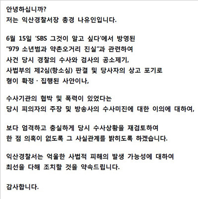 익산경찰서장 나윤인 총경은 "'그것이 알고싶다-979 소년범과 약촌 오거리의 진실'과 관련한 수사는 사건 당시 경찰의 수사와 검사의 공소제기, 사법부의 제 2심(항소심) 판결 및 당사자의 상고 포기로 형이 확정·집행된 사안이나, 수사기관의 협박 및 폭력이 있었다는 당시 피의자의 주장 및 방송사의 수사미진에 대한 이의에 대하여, 보다 엄격하고 충실하게 당시 수사상황을 재검토하여 한 점 의혹이 없도록 그 사실관계를 밝히도록 하겠습니다"고 공식 입장을 전했다.