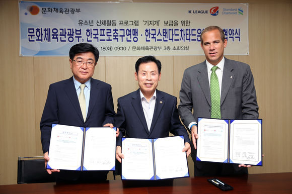 한국프로축구연맹(총재 권오갑)과 스탠다드차타드은행(행장 리차드 힐), 문화체육관광부(장관 유진룡)가 18일 오전 9시 10분 서울 종로구 와룡동 문화체육관광부 제2차관실(3층)에서 ‘유소년 신체활동 프로그램, 기지개 보급 상호협력 양해각서(MOU)’를 체결했다.