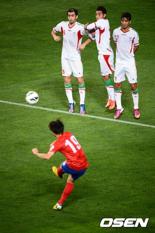 18일 오후 울산 문수축구경기장에서 진행된 2014 브라질월드컵 아시아지역 최종예선 A조 8차전 대한민국과 이란의 경기 전반전 김치우가 프리킥을 차고 있다.