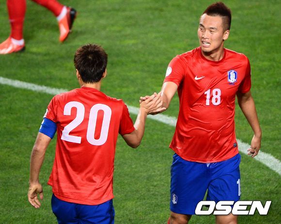 18일 오후 울산 문수축구경기장에서 진행된 2014 브라질월드컵 아시아지역 최종예선 A조 8차전 대한민국과 이란의 경기 전반전 이동국이 투치 넘치는 플레이를 하자 김신욱이 격려하고 있다.