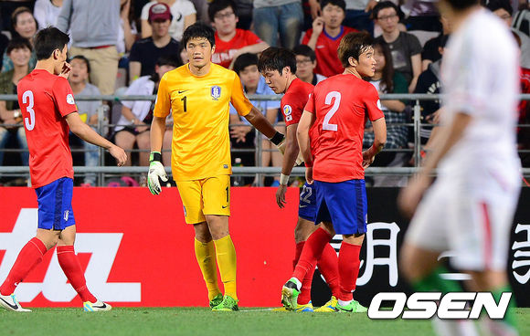 18일 오후 울산 문수축구경기장에서 진행된 2014 브라질월드컵 아시아지역 최종예선 A조 8차전 대한민국과 이란의 경기 후반 이란 구차네자드 선취골 때 정성룡 골키퍼가 패스 실수를 범한 김영권을 격려하고 있다