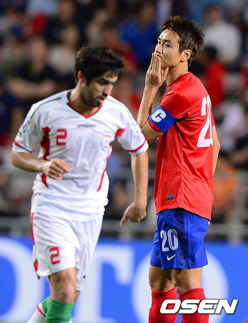 18일 오후 울산 문수축구경기장에서 진행된 2014 브라질월드컵 아시아지역 최종예선 A조 8차전 대한민국과 이란의 경기 후반 이란 구차네자드가 선취골때 이동국이 아쉬워하고 있다