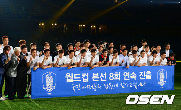 경기 종료 후 열린 월드컵 본선 8회 연속 진출을 이룬 대한민국 국가대표팀이 기념 촬영을 하고 있다. /sunday@osen.co.kr