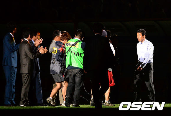 경기 종료 후 열린 출정식에서 최강희 감독이 역대 국가대표팀 감독 및 코치들의 박수를 받으며 입장하고 있다. /sunday@osen.co.kr