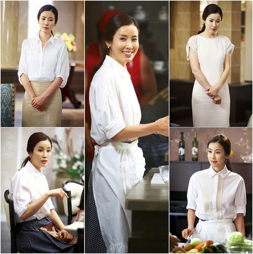가족들의 식사를 준비하는 장면에서는 깔끔한 화이트톤의 셔츠에 짙은 컬러의 도트무늬 스커트를 매치하고 새하얀 앞치마를 둘러 전체적으로 깨끗한 느낌을 연출했으며, 시어머니가 혼수이야기를 꺼내자 어두워진 모습으로 고개를 숙이고 있는 장면에서는 거의 컬러감이 드러나지 않는 옅은 핑크톤의 원피스에 단정하게 빗어 묶은 헤어스타일로 과하지 않으면서도 고상하고 세련된 청담동 며느리룩을 보여주었다.