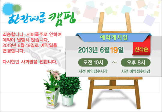 지난 17일 서버 폭주로 접속이 안돼 19일로 연기됐던 한강여름캠핑 예약이 홈페이지(http://www.hangangcamping.co.kr/s3-2.php)에서 실시되고 있다. 서울시는 "사전 예약 접수 시간은 오전 10시부터 오후 8시까지"라며 "선착순으로 진행된다"고 밝혔다.