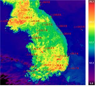 영상을 살펴보면 관측된 적외선 영상의 처리를 통해 한반도 전 지역의 온도 분포, 해양의 온도 분포 및 지역 별 온도를 추출해 낼 수 있다.