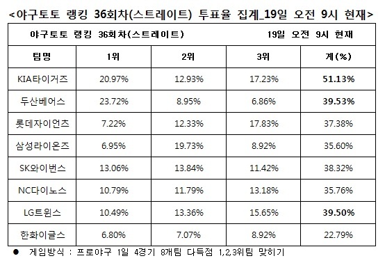 국민체육진흥공단(www.kspo.or.kr)이 발행하는 체육진흥투표권 수탁사업자인 스포츠토토 공식발매사이트인 베트맨(www.betman.co.kr)은 20일에 개최되는 두산-롯데, SK-삼성, 한화-KIA, NC-LG 등 4경기 8개팀을 대상으로 한 야구토토 랭킹 36회차 스트레이트 게임 중간집계결과 KIA(51.13%), 두산(39.53%), LG(39.50%)를 차례로 다득점 상위 3개팀으로 꼽았다고 밝혔다. 반면 삼성(35.60%), 한화(2.79%)는 가장 적은 득점을 기록할 것으로 예상했다.