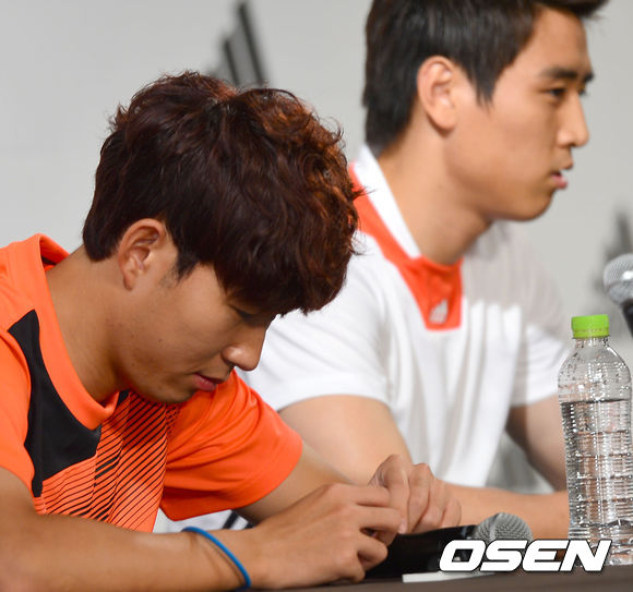 기자회견에 참석한 구자철과 손흥민이 취재진의 질문에 답하고 있다.
