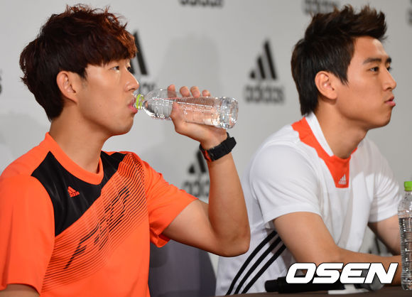 기자회견에 참석한 구자철과 손흥민이 취재진의 질문에 답하고 있다.