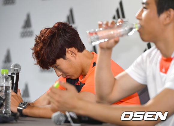 기자회견에 참석한 구자철과 손흥민이 취재진의 질문을 기다리고 있다.