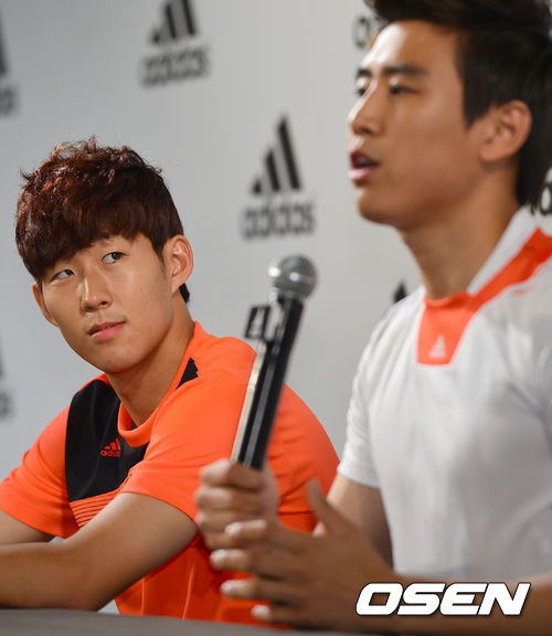 기자회견에 참석한 구자철과 손흥민이 취재진의 질문에 답하고 있다.