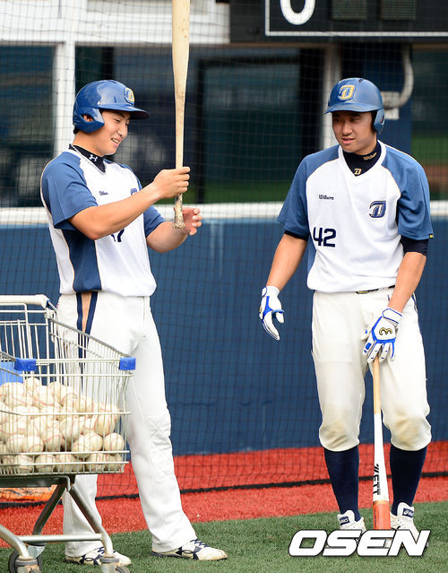 19일 오후 창원 마산야구장에서 열린 2013 한국야쿠르트 세븐프로야구 NC 다이노스와 LG 트윈스의 경기, 경기에 앞서 NC 나성범이 김태군의 배트를 살피고 있다.