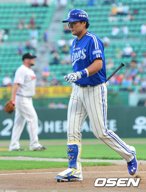 19일 오후 인천 문학구장에서 '2013 한국야쿠르트 세븐 프로야구' SK 와이번스 대 삼성 라이온즈의 경기가 열렸다. 1회초 삼성 공격 2사 주자없는 상황 3번 이승엽이 SK 선발 레이예스의 공에 헛스윙 삼진을 당하고 더그아웃으로 들어가고 있다.