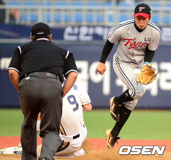 19일 오후 창원 마산야구장에서 열린 2013 한국야쿠르트 세븐프로야구 NC 다이노스와 LG 트윈스의 경기, 1회말 1사 1루에서 NC 나성범 타석 때 1루주자 김종호가 도루에 성공하고 있다.